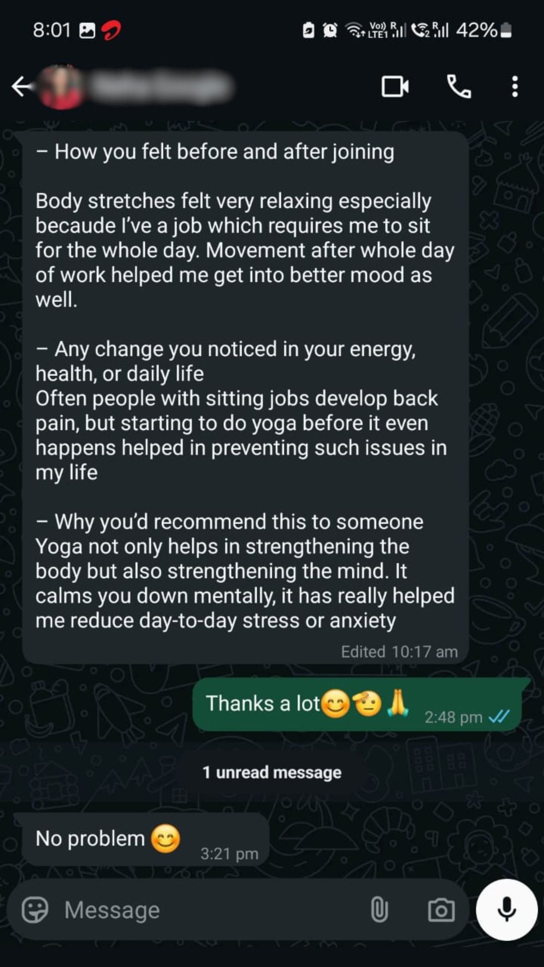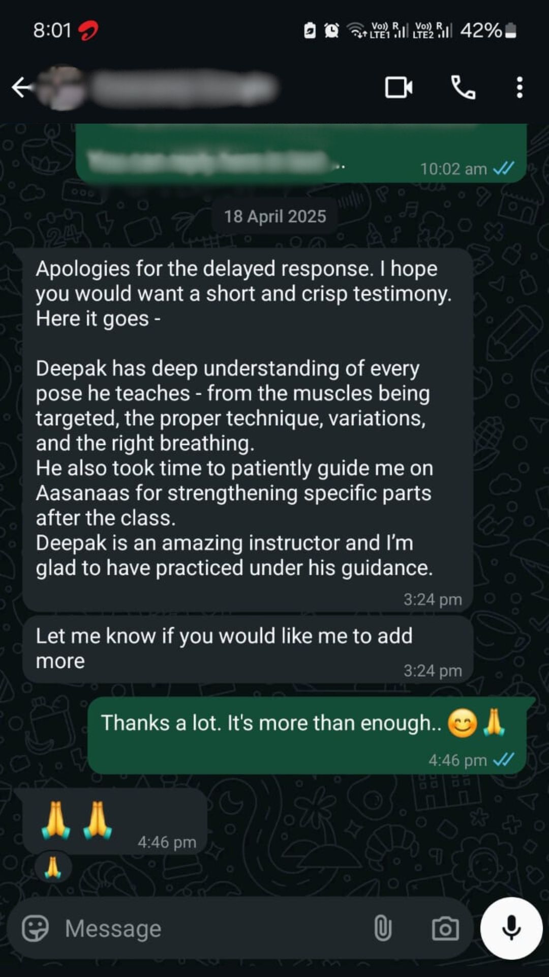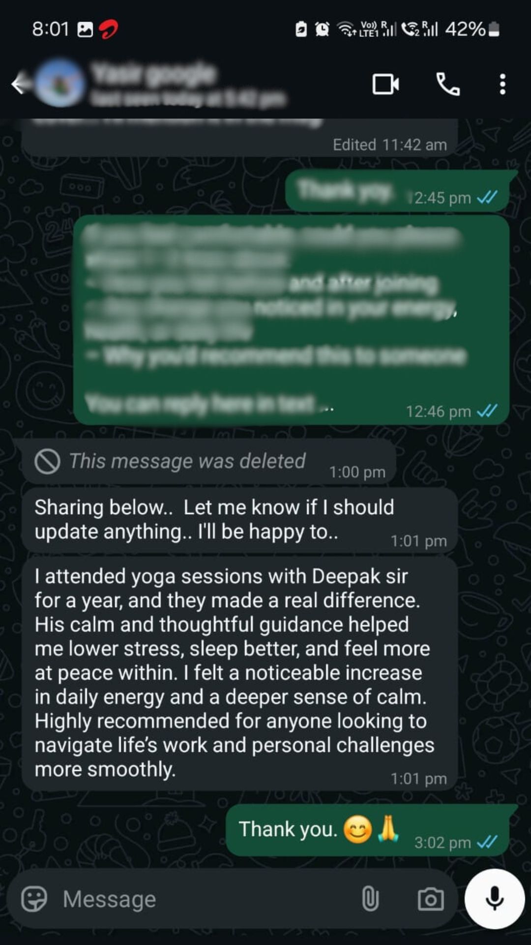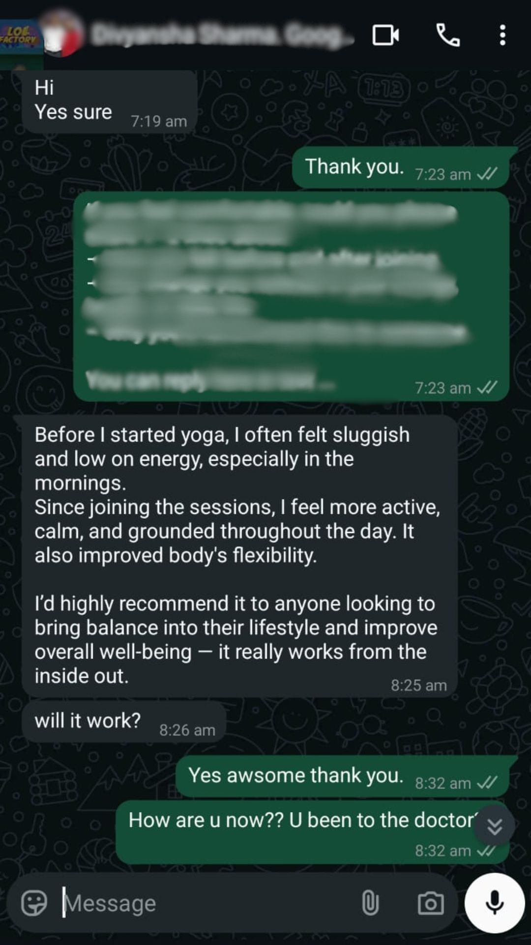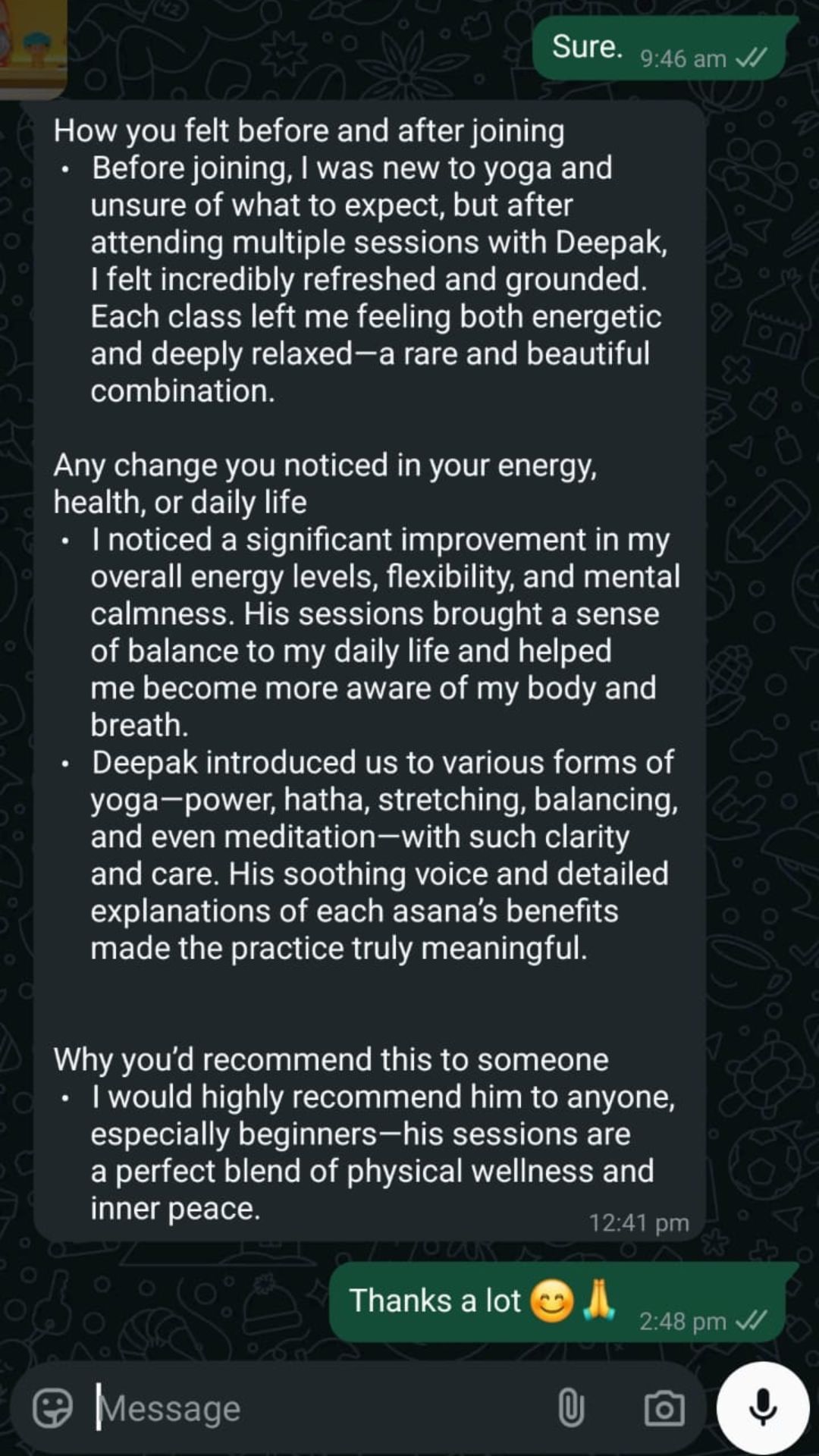 Ans : Yes! I’ll modify poses to fit your body’s needs, ensuring a safe practice even with injuries or limitations.
